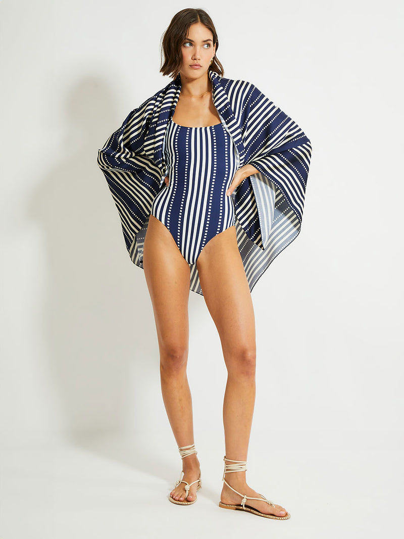 The Eshe Navy Collection is a fresh new take on a lemlem classic, featuring a classic navy background with ivory stripes and dots on a silky fabric, offering a look that's less beach and more chic.