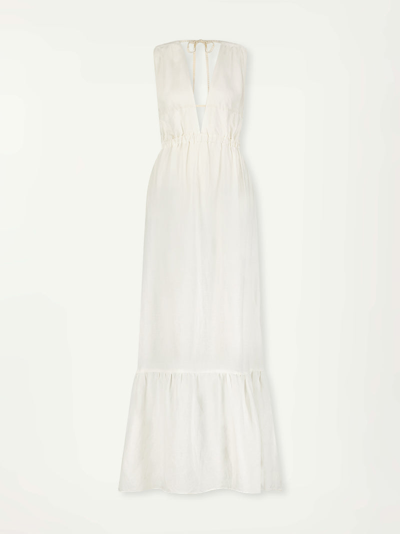 The Kelemi White Collection features classic white linen tencel silhouettes accented with lemlem signature tibeb pattern on belts and ties.