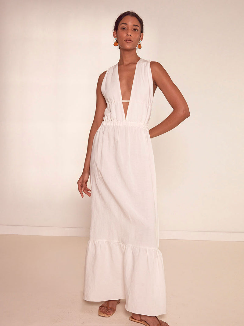 This maxi V-neck dress features a deep plunge neckline, bare sides, and maxi length for a showstopping silhouette. This dress comes with straps that can be adjusted for a perfectly customized fit.