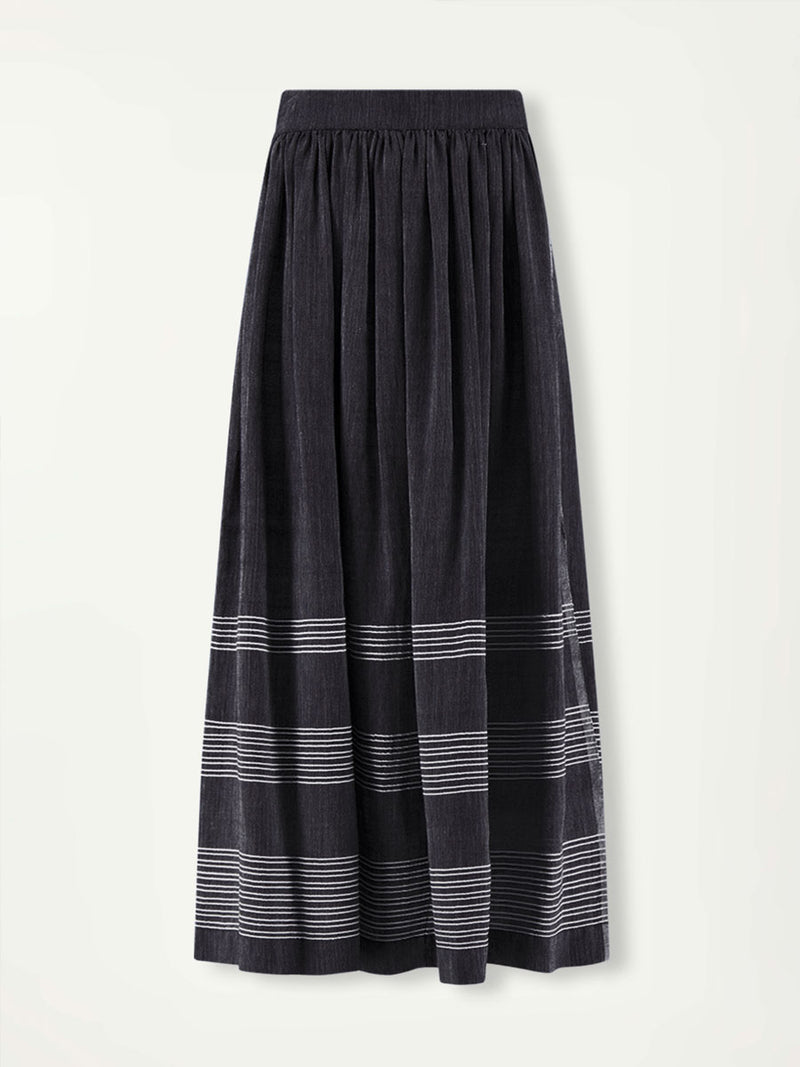 This skirt features a flowy silhouette with a gathered waistband for a soft, billowing look. A button detail at the waistband adds charm, while a high side slit creates movement and a touch of allure.