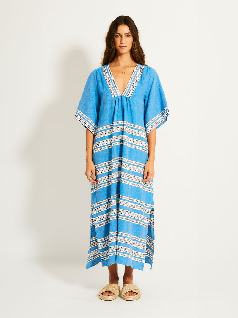 This dress features a flattering V-neck plunge neckline with a wide self-fabric facing detail, short bell sleeves, ruching at the center front and shoulders, and side slits. It boasts a long, relaxed maxi silhouette for a laid-back, chic feeling.