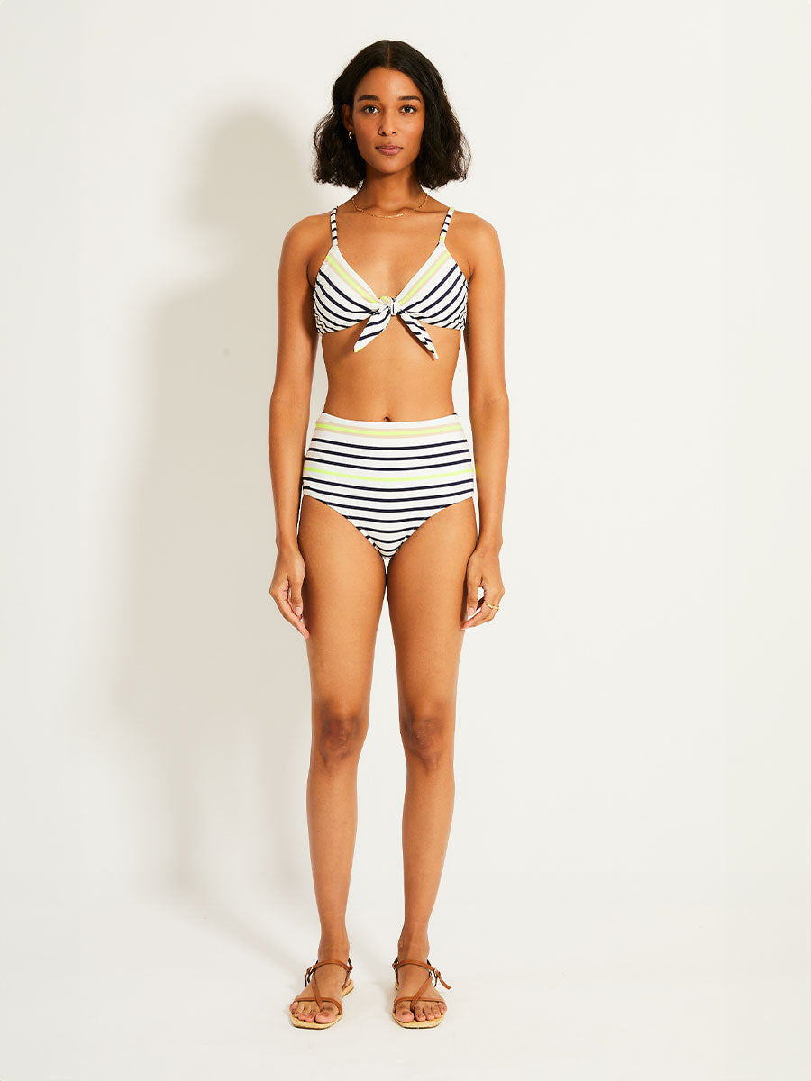 The Bahar Cream Collection features an ivory ground with navy stripes, accented by khaki and citron hues. lemlem’s unique take on a classic Breton stripe is elevated with a signature fluorescent stripe for a modern twist.