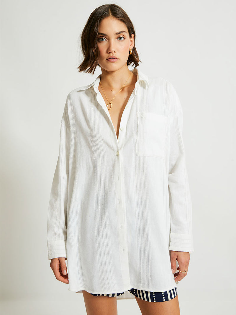 This shirt features an oversized, relaxed silhouette, side pockets, a back yoke, a curved shirttail hem, and sustainably sourced and produced natural shell buttons. It can be worn as a swim cover-up, a shirt, or a short dress.