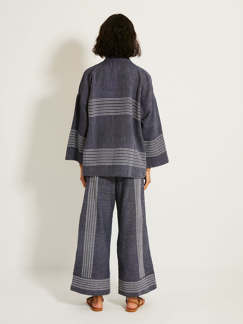 The Mari Navy Collection features chambray navy color accented with fine, textured white stripes, creating a sophisticated denim-inspired look.