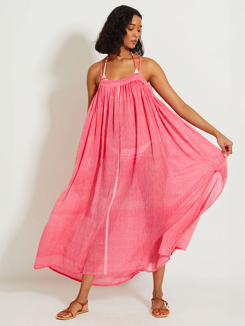The Nefas Fragaria collection features airy gauze fabric in a bright and rich watermelon pink. Perfect for layering over colorful swimwear or pairing with other handwoven styles to create a soft, feminine beach look.