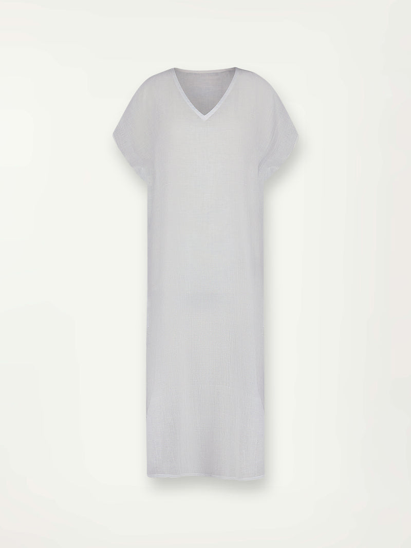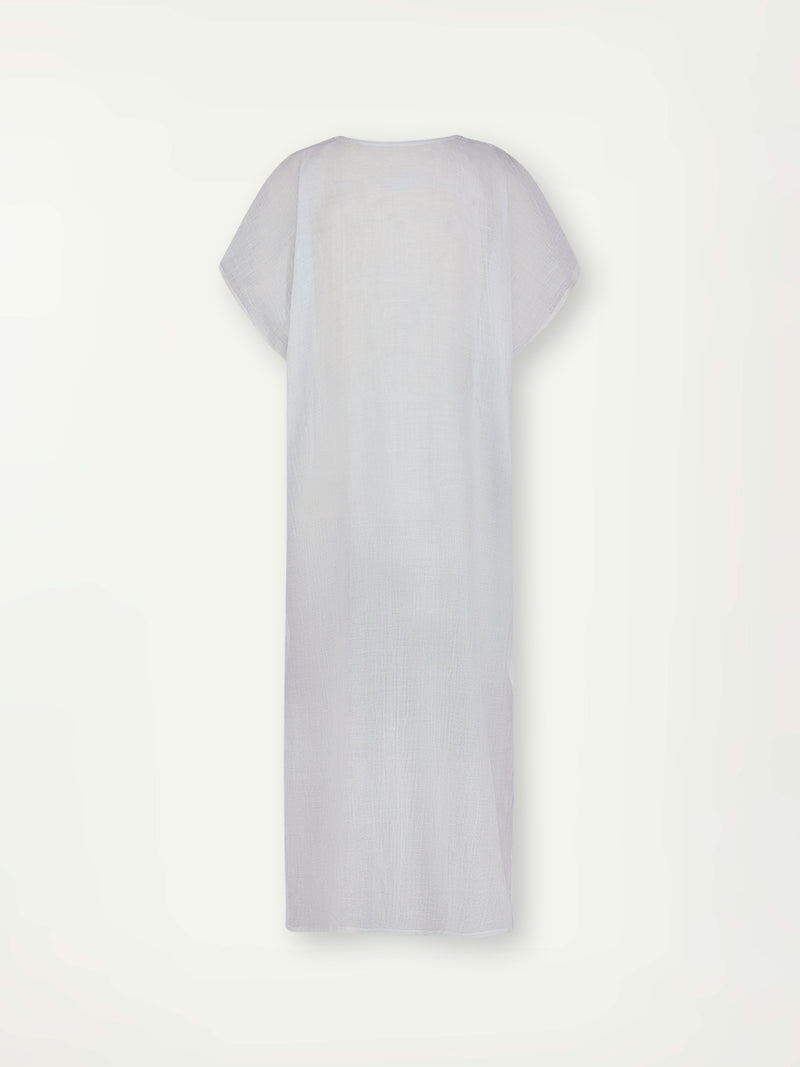 The Nefas Sky Collection features airy gauze fabric in a delicate pale blue color. Perfect for creating a soft and feminine beach look when worn over with colorful swimwear.
