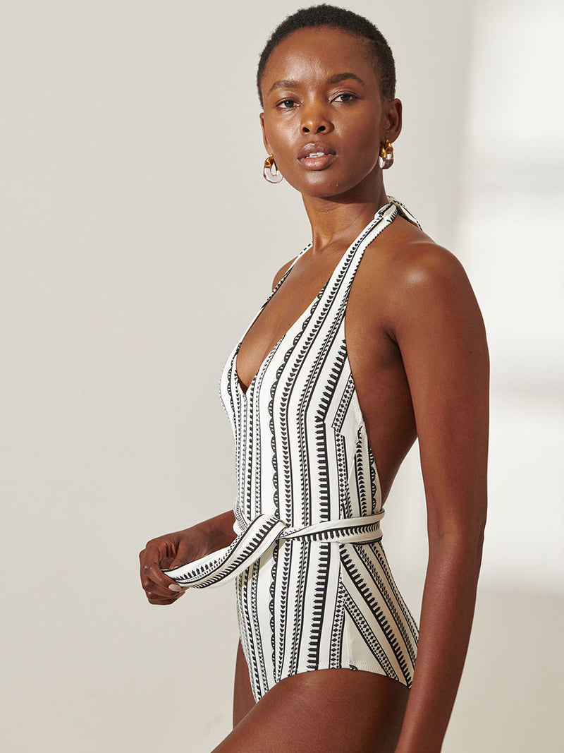 The fully lined deep V one piece swimsuit is where simplicity meets sensuality. This silhouette features a plunging neckline and a removable belt flattering the waistline. The back neck tie allows for an adjustable fit.