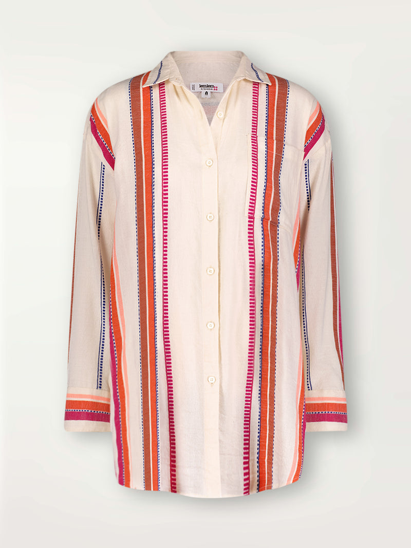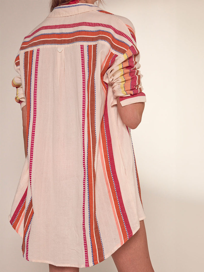 This shirt features an oversized, relaxed silhouette, side pockets, a back yoke, a curved shirttail hem, and sustainably sourced and produced natural shell buttons. It can be worn as a swim cover-up, a shirt, or a short dress.
