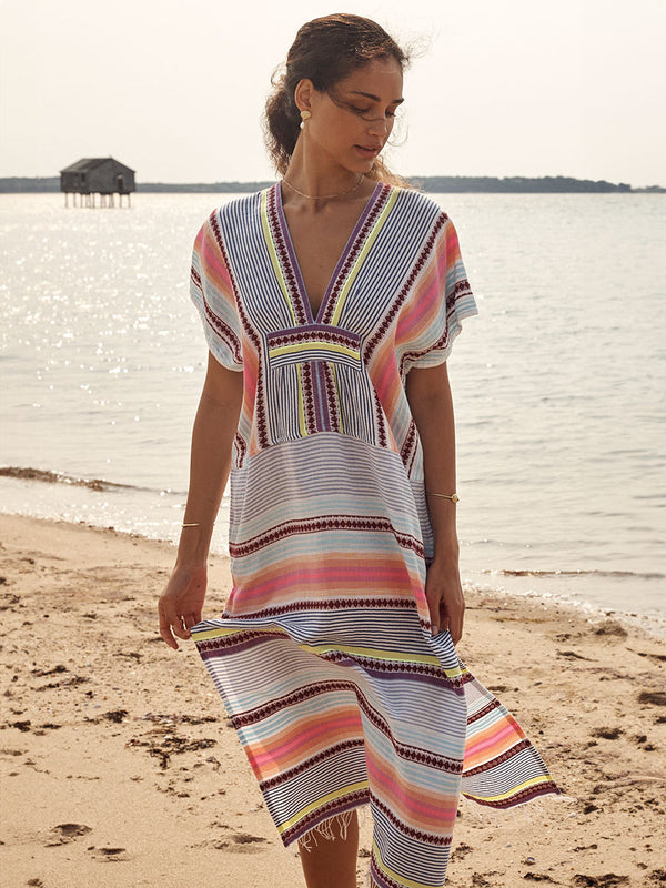 The Cirq collection features a bold and joyful take on stripes, combining sun-washed pinks, vibrant orange, soft lilac, teal, and pops of neon yellow—all accented with Tibeb-inspired black-and-white detailing.