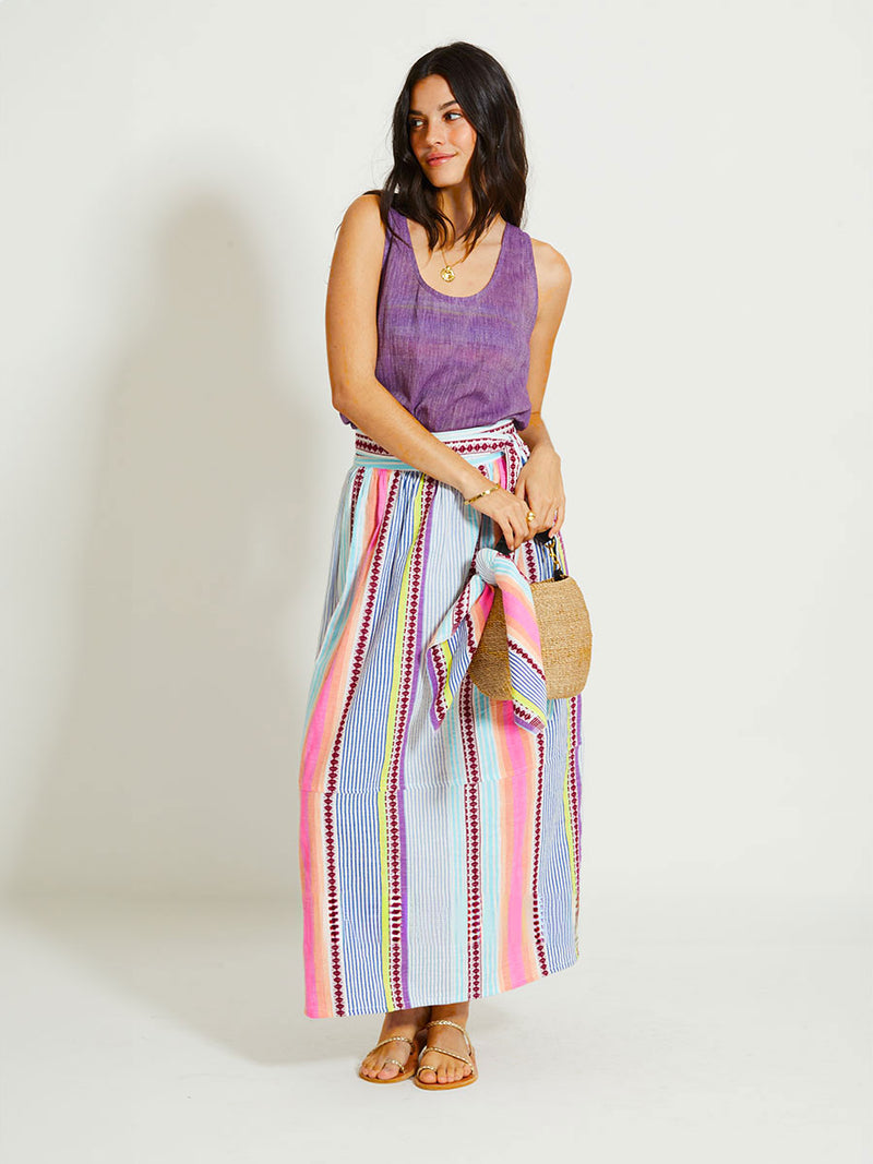 Vibrant and full of color, the Cirq collection features intricate stripes in sun-washed hues and a Tibeb-inspired pattern in rich dark plum.