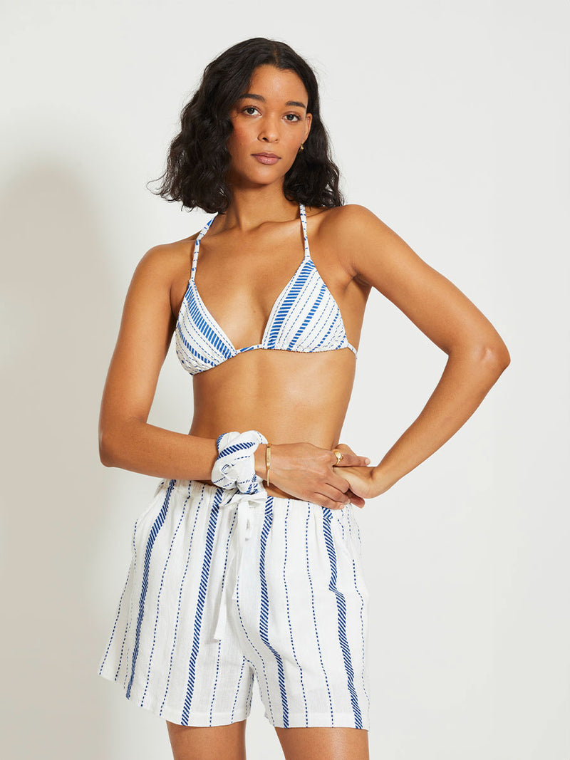 The Tiki Azure collection features crisp white fabric woven with diagonal dotted stripes in bright blue and a subtle textured weave, creating a clean and effortless look.
