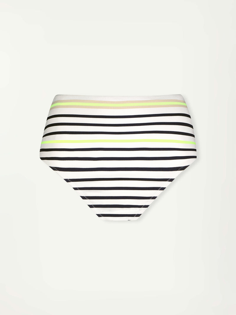 The Bahar Cream Collection features an ivory ground with navy stripes, accented by khaki and citron hues. lemlem’s unique take on a classic Breton stripe is elevated with a signature fluorescent stripe for a modern twist.