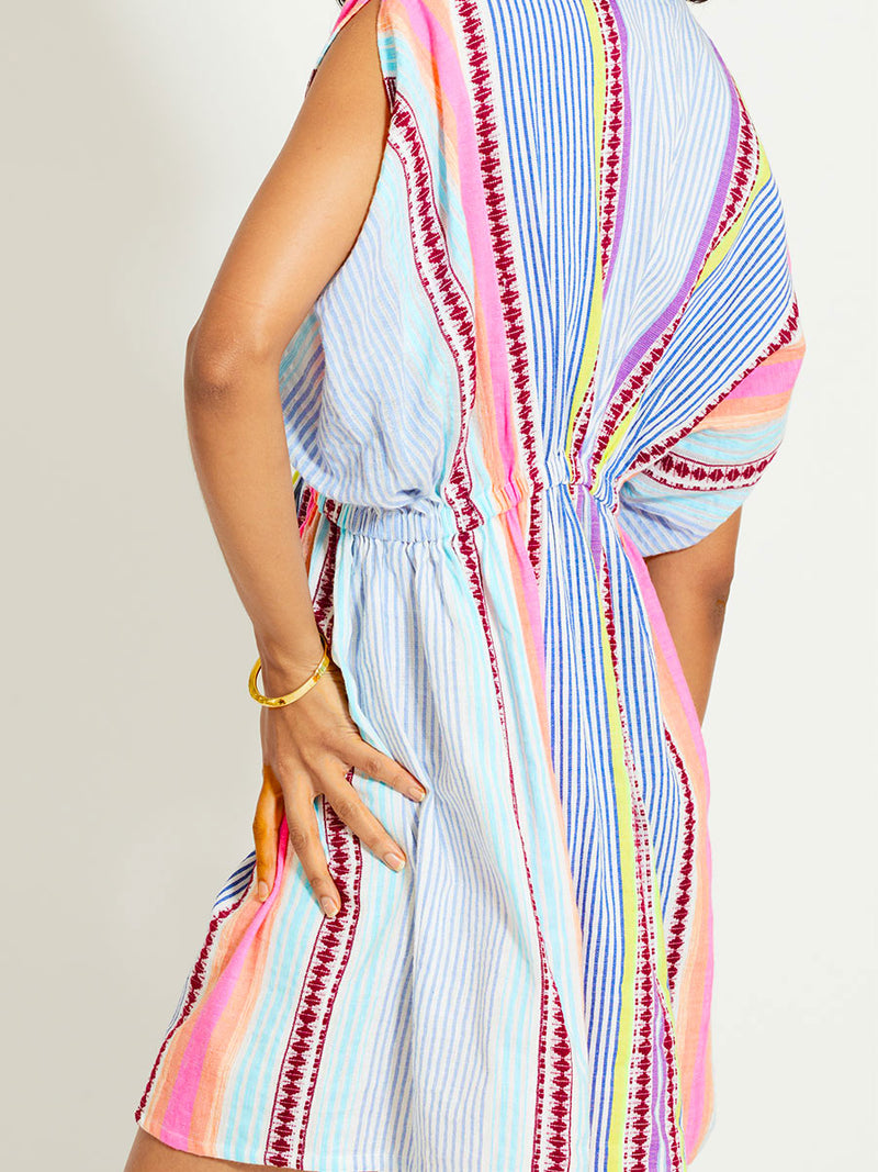This versatile short dress features dolman sleeves, a deep plunge neckline and comfortable elastic waist to create an hourglass silhouette. The ruffled hem makes this style a resort wear staple.