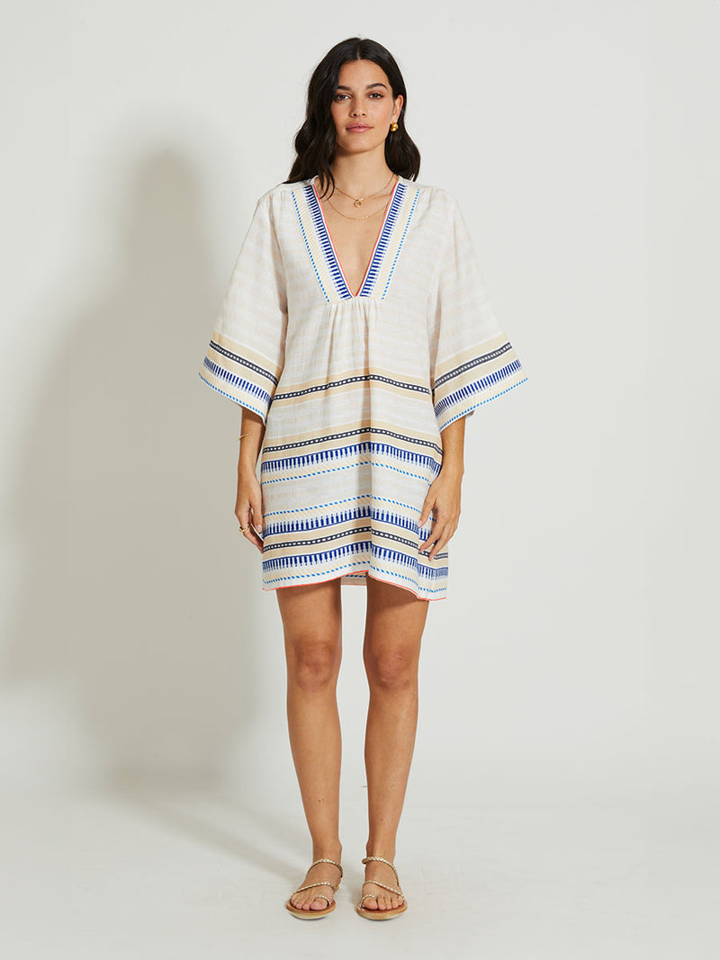 This chic caftan features a mini silhouette with a flattering deep V-neckline and bell sleeves for an effortlessly stylish and bohemian look.