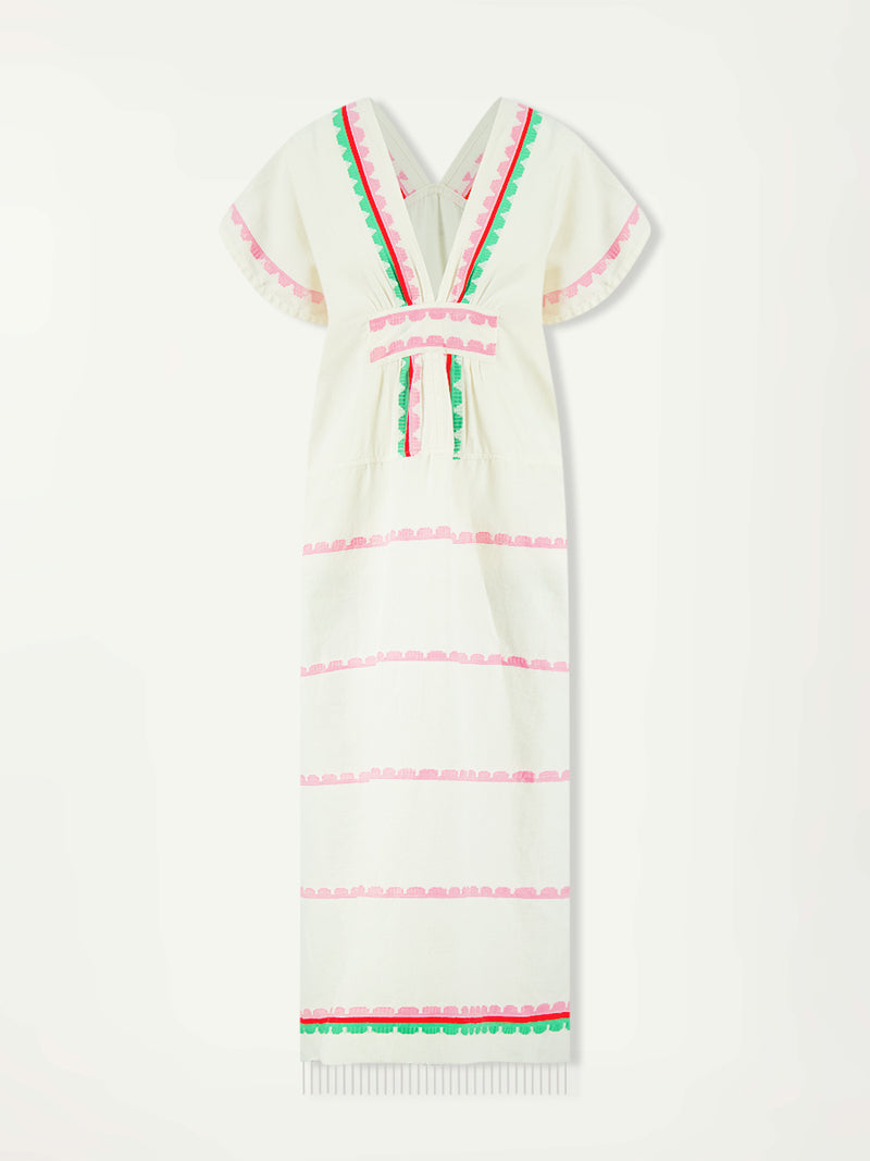 This long caftan features a deep V-neckline, relaxed sleeves, and an easy straight silhouette with high side slits.