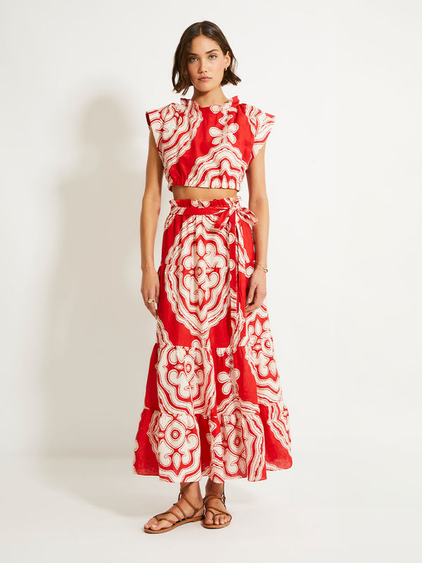 The Niku Red Collection features a custom-designed print inspired by ancient architectural patterns, blending the classic with the contemporary. The design is brought to life with a rich, vibrant red, perfectly grounded by creamy ivory for a striking and timeless look.