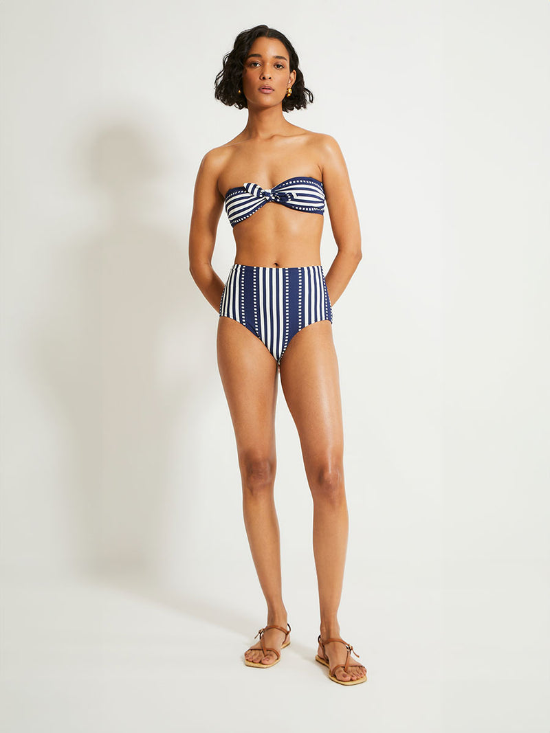 The fully lined high waist bikini bottom offers a flattering and moderate coverage with its low-cut leg opening. The bow tie in the back adds a touch a elegance to the silhouette.