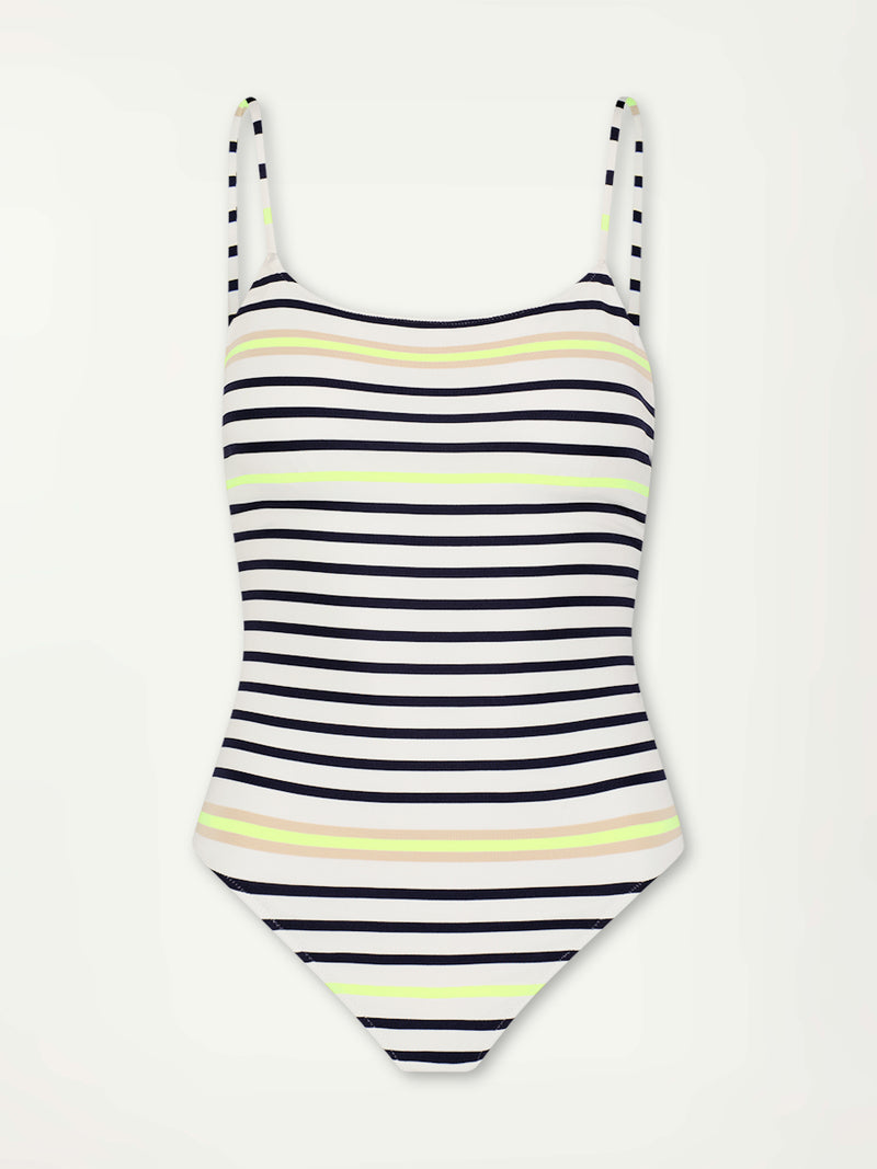 The fully lined classic one piece features a wide scoop neckline, adjustable spaghetti straps and a low back. The interior shelf bra with removable pads allows for the perfect fit for all shapes and cup sizes.