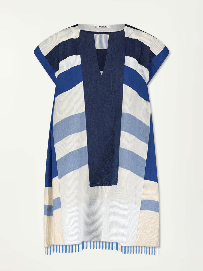 The Betami Azure Collection features a striking color-block combination of three shades of blue, paired with bands of neutral cream and white, inspired by handmade indigo quilting and African textiles.