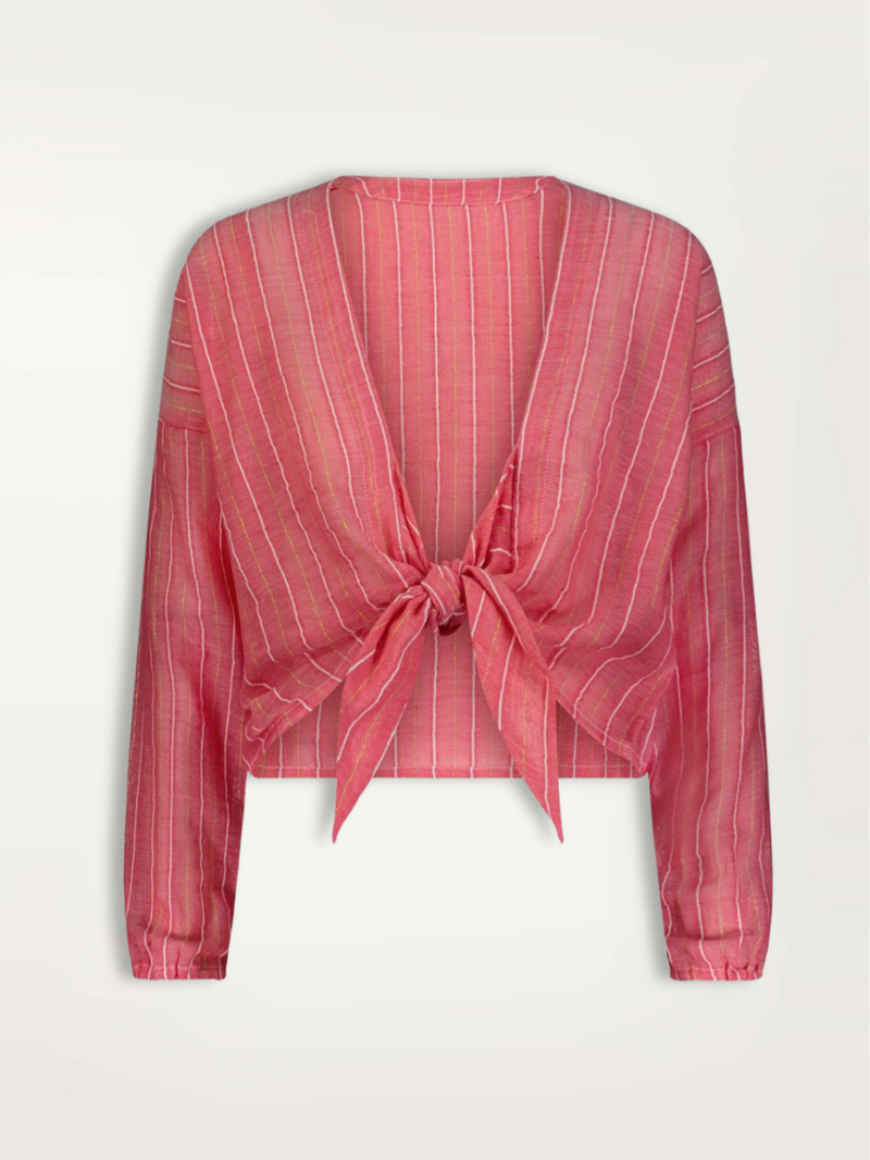 This elegant top showcases a deep V-neckline, long sleeves, and a sophisticated tie-front detail for a refined silhouette.