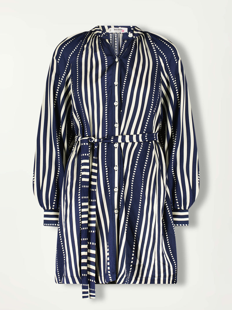 La collection Eshe Navy est une nouvelle version d'un classique lemlem, avec un fond bleu marine classique avec des rayures et des pois ivoire sur un tissu soyeux, offrant un look moins plage et plus chic.