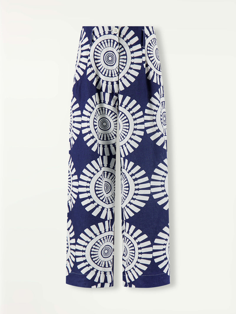 The Zeina Navy collection features a bold geometric medallion printed on soft navy linen, inspired by traditional Tibeb motifs.
