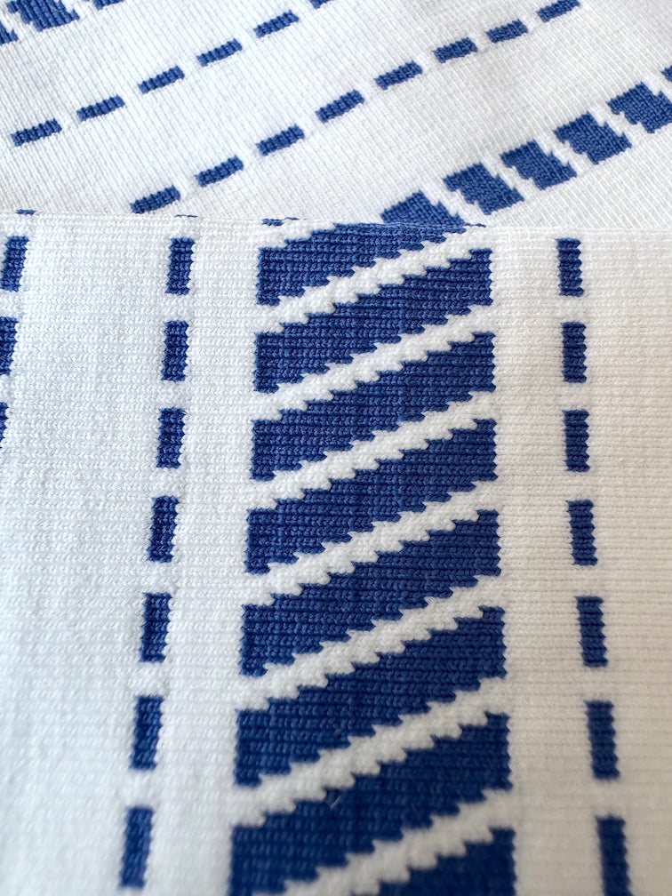 The Tiki Azure collection features a custom jacquard in crisp white and bright blue, inspired by our handwoven pattern.