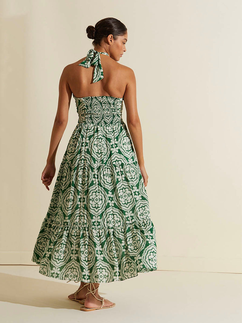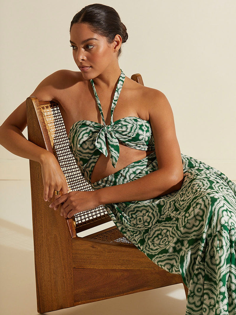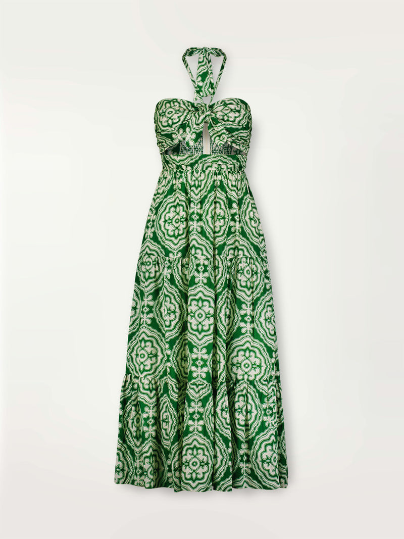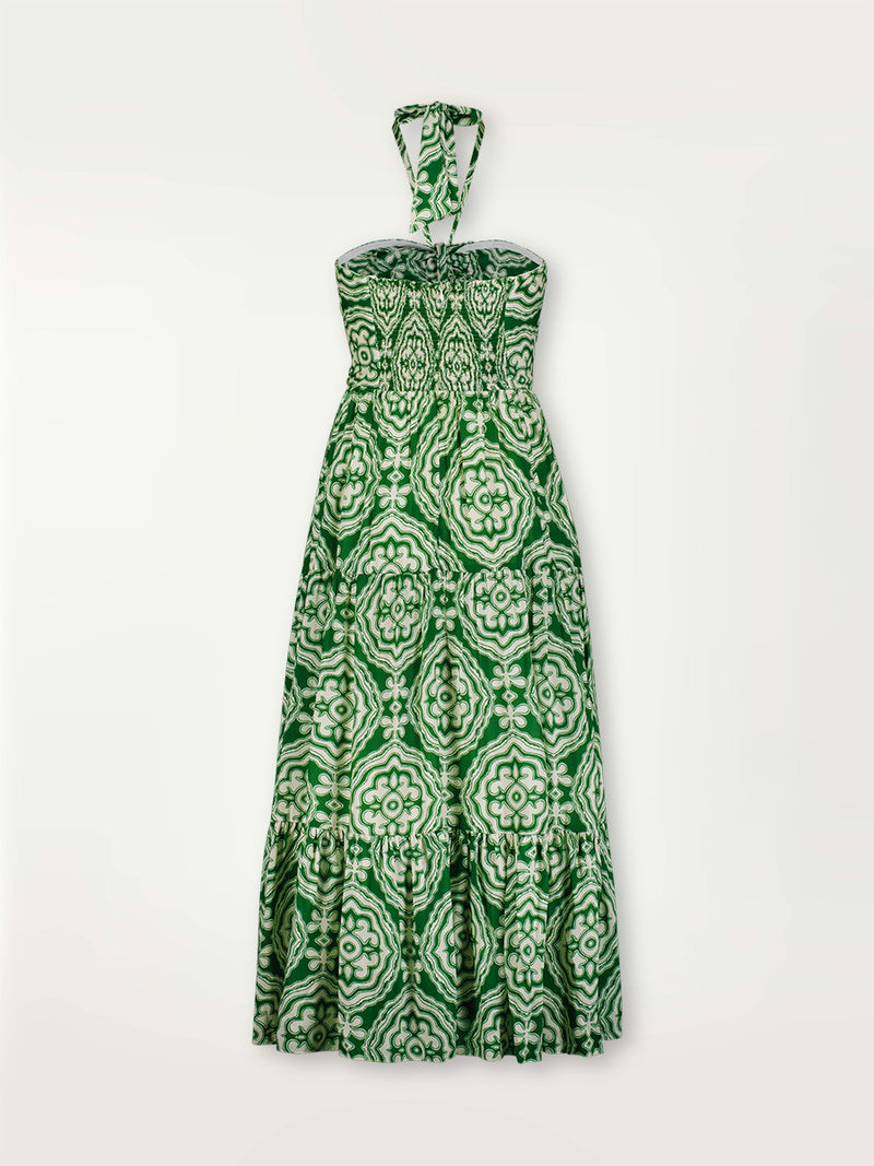 The long dress features a strapless ruched bodice, with interior gripper tape. The removable front tie and halter string allows for multiple styling options. The front interior elastic waist and zipping smoked back offer a secure and adjustable fit.